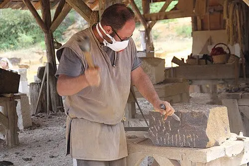 The image above shows a modern man who is using Medieval-era tools and methods while working as a traditional stonemason at a historical reenactment location. Image courtesy of wikipedia.org